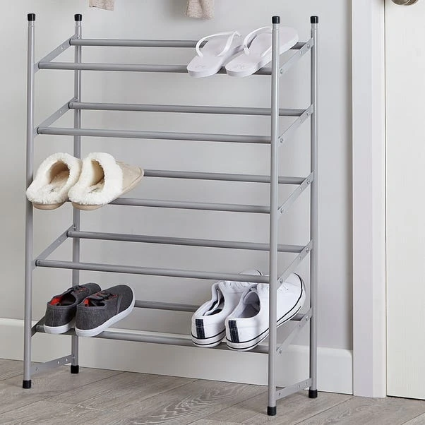 Designed with five practical tiers for neat, space saving storage for your shoes, this five tier extendable shoe rack is suitable to hold up to 25 pairs of shoes and it is stackable to save space. Designed from steel with non-slip feet caps, this extendable shoe rack requires assembly.