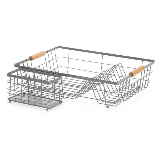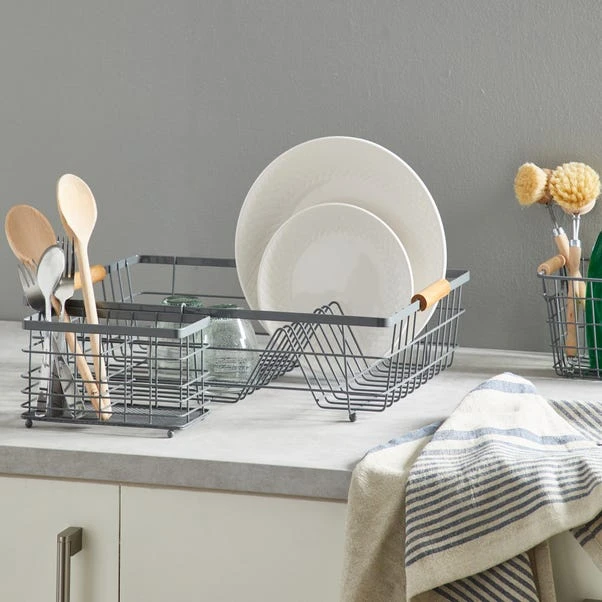 Made from metal with bamboo handles, this practical dish drainer has been finished in a grey colour and is perfect to place your draining dishes and cutlery for neat space saving on your worktop.