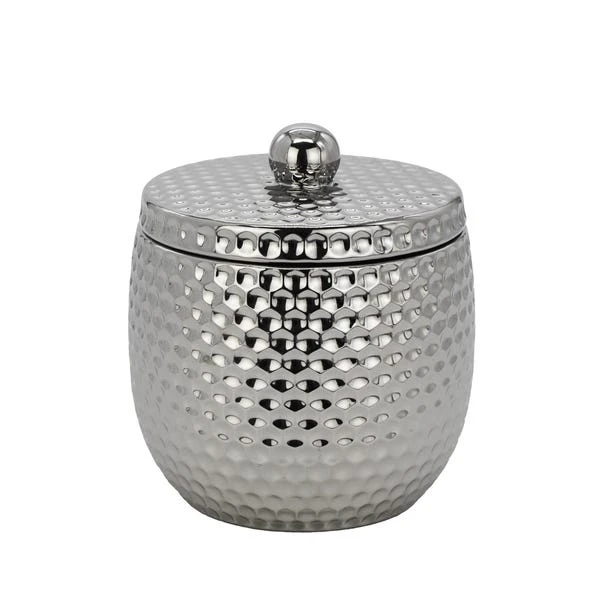 This hammered effect silver trinket pot comes complete with a lid to safely store your bathroom essentials or act as a decorative piece.