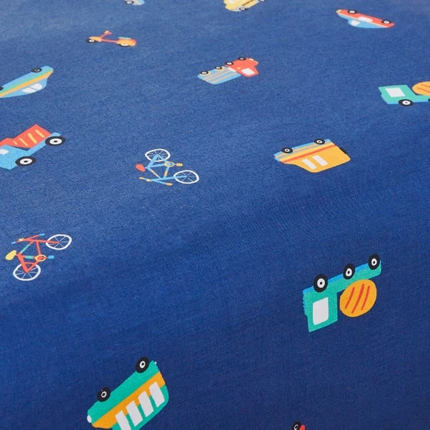 Cover your little one’s bed in style with these fitted sheets. One sheet feature a multi-directional transport themed pattern on a navy background. The second sheet is a plain blue colour. Each sheet is crafted from an easy to care for polycotton material which is fully machine washable.