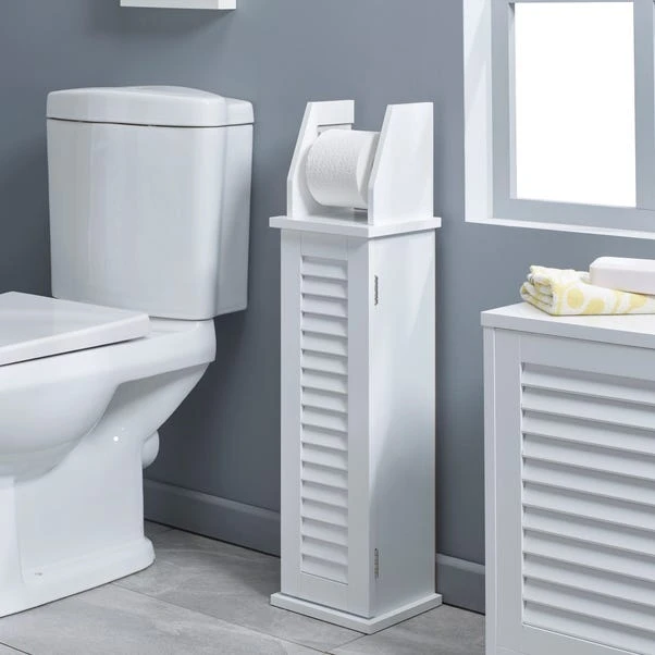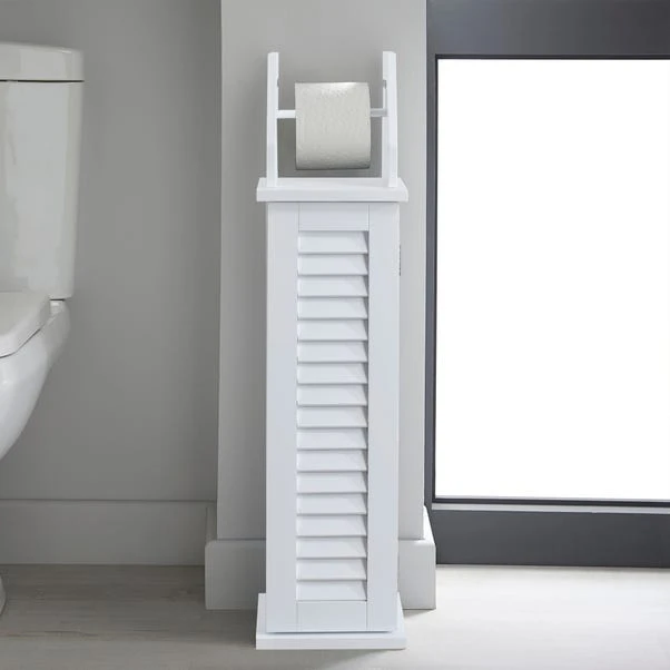 Designed with a contemporary white finish, this toilet roll storage unit from the Tuscany bathroom collection has been designed with a toilet roll holder on the top and features addition storage space underneath with a hinged slatted door design, perfect for keeping your spare toilet rolls in an easy to access place.