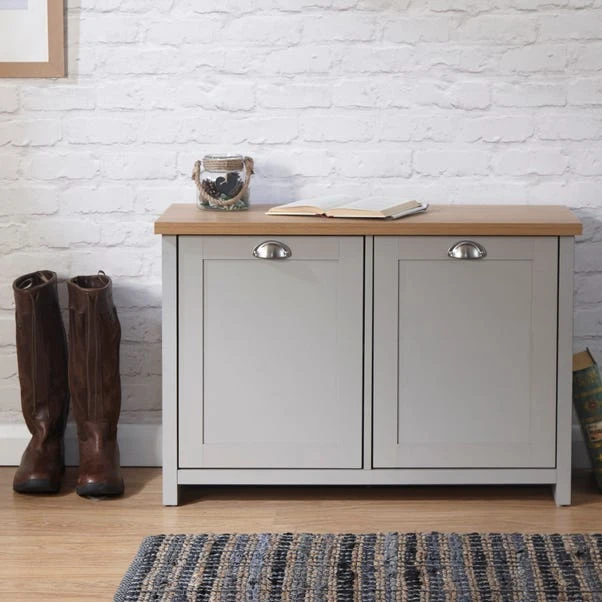Inspired by countryside cottages, this Lancaster Shoe Cabinet is complete with four shelves and is perfect for neatly storing away footwear. Available in either a cream or grey colourway, and featuring a contrasting oak effect top, this product is as stylish as it is practical.