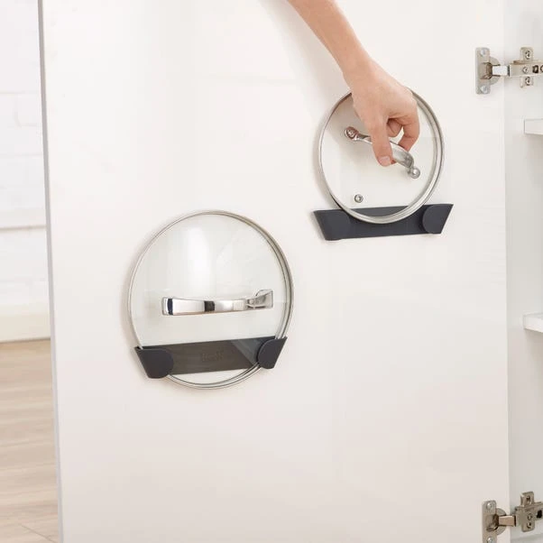 Pan lids can often be awkward items to store but not any more with this simple solution. Supplied as a set of four, each individual holder can be mounted onto the inside of a cupboard door or deep drawer and neatly holds one pan lid. Easy to install using strong 3M™ VHB™ tape, the holders are suitable for standard lids 16-24 cm (6¼-9½ inches) in diameter.