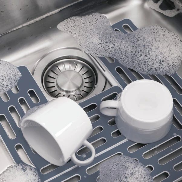Designed to safeguard sinks from scratches and chips, this grey Joseph Joseph adjustable sink saver adjusts to fit different plug positions and locks neatly together and benefits from a manoeuvrable surface allowing water to drain and air to circulate quickly and efficiently.